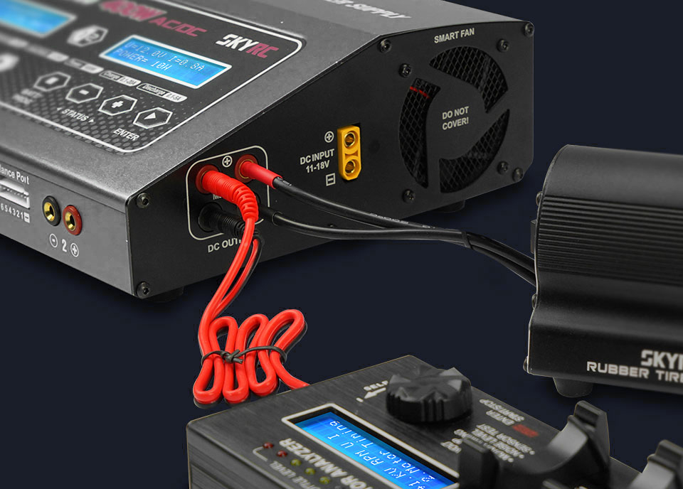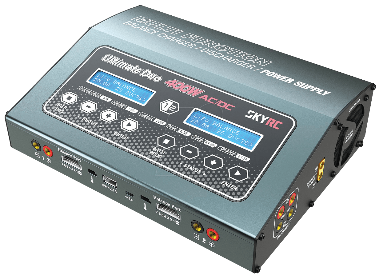 SkyRC D400, çift kanallı (dual-channel) bir dengelemeli (balance) şarj / deşarj cihazı & güç kaynağıdır. İki bağımsız devresi vardır — dolayısıyla aynı anda iki farklı bataryayı (tip ve kimyası fark etse bile) şarj edebilirsiniz.